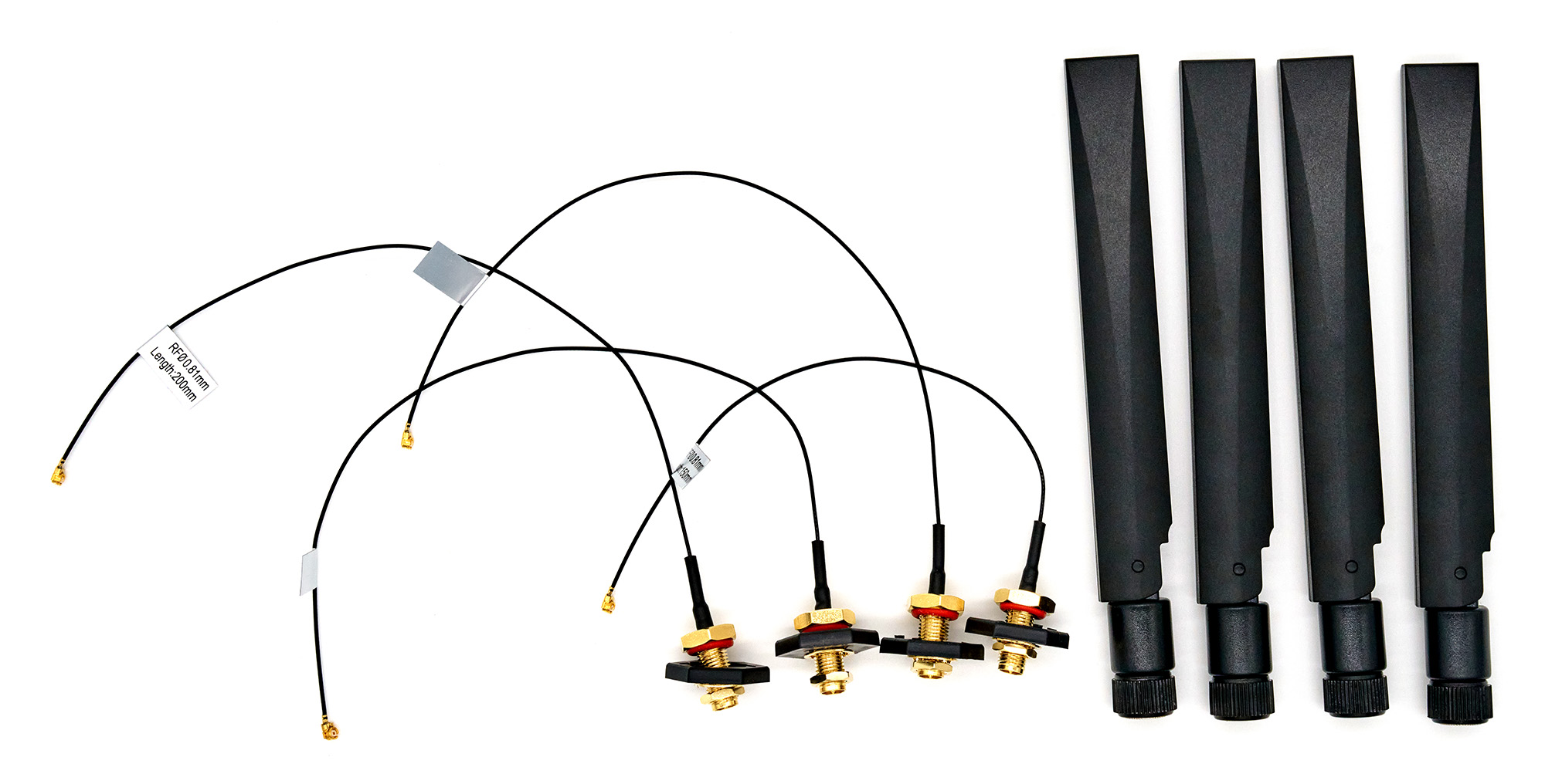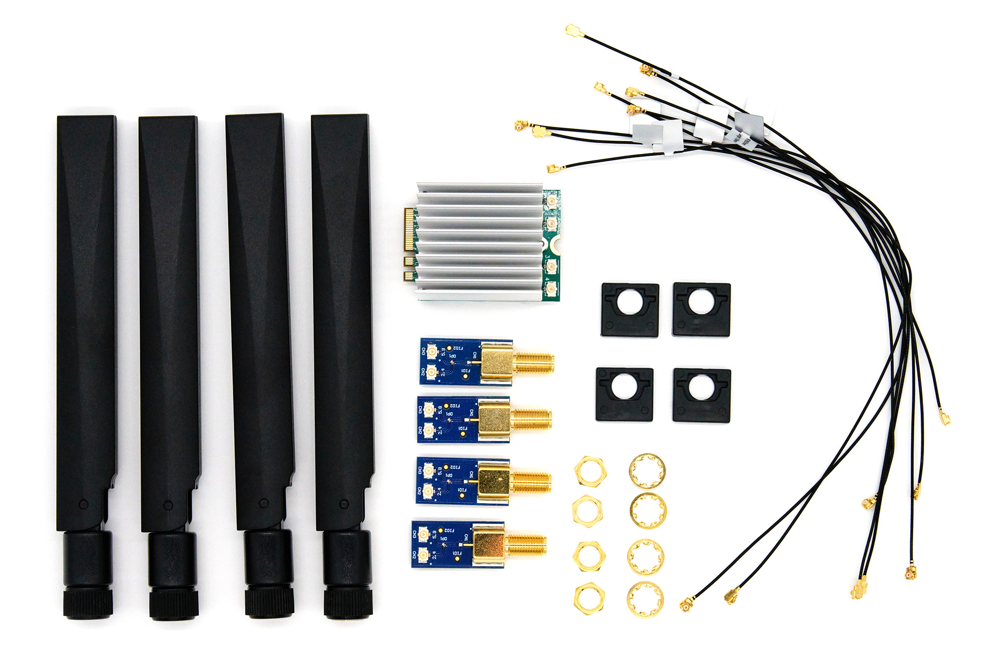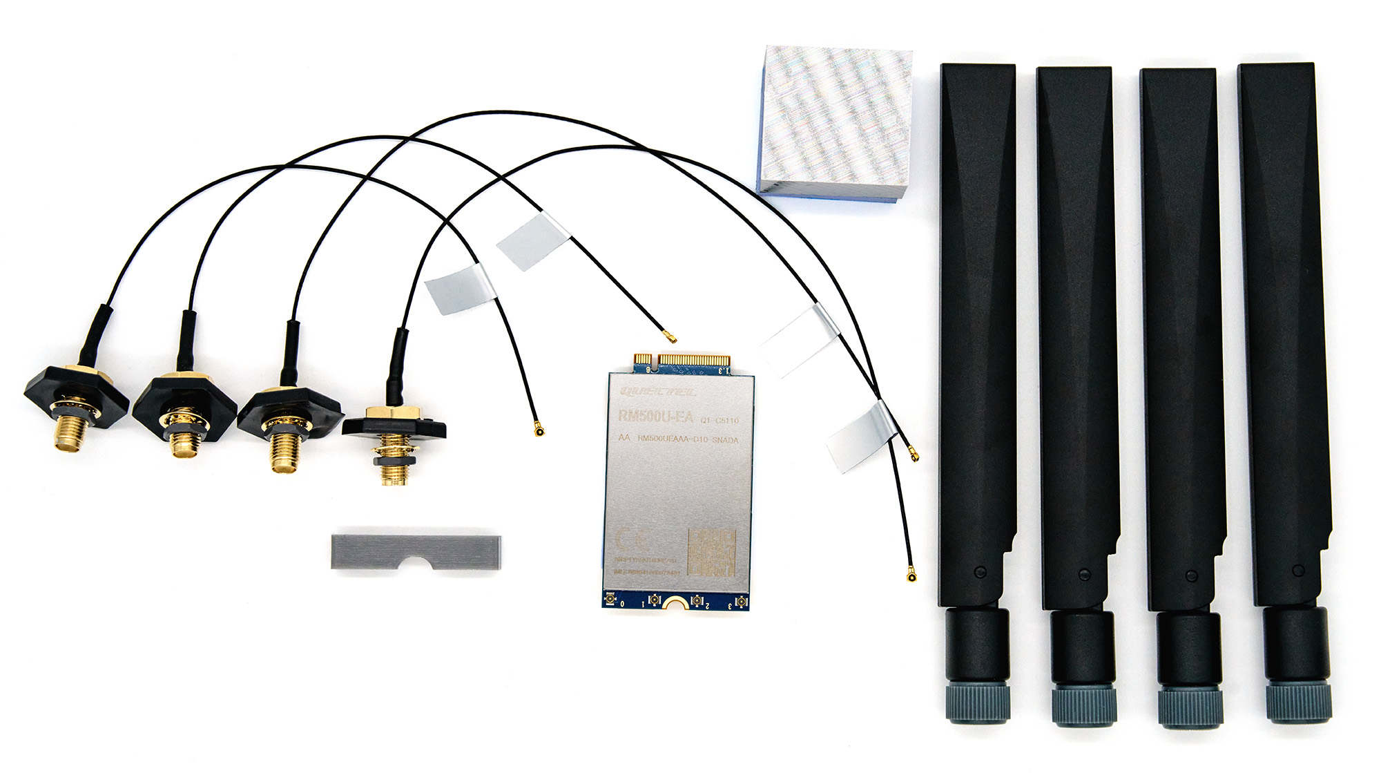 The kit contains a 5G card Quectel RM500UEA, four 5G antennas, two 15cm MHF4-SMA pigtails, two 20cm MHF4-SMA pigtails, four plastic pigtail holders, a plastic clip to secure MHF-4 connectors, a aluminium heatsink, and two thermal pads.